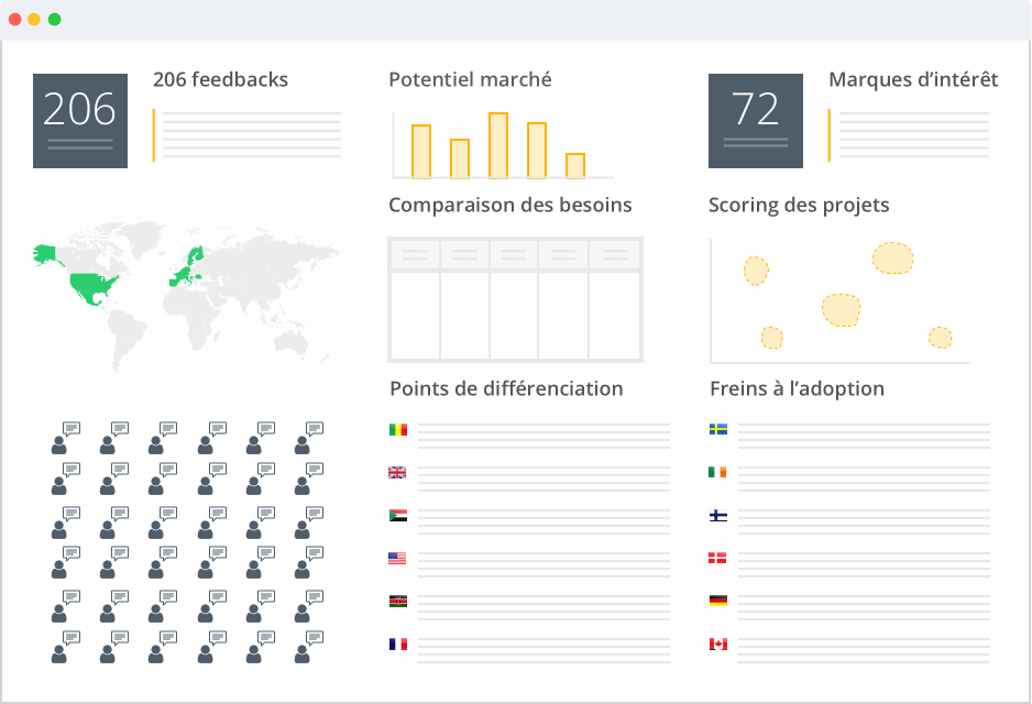 En un mois, nous avons collecté 206 feedbacks de professionnels à l’échelle mondiale. Nous avons ensuite établi un scoring des 5 projets selon différents critères afin de les prioriser objectivement. Ces résultats sont présentés sous différents formats intelligents : synthèse vidéo, synthèse web segmentable, synthèse décisionnelle…